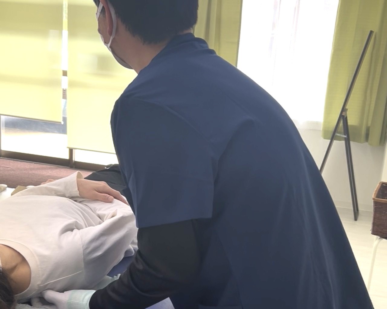 まずは背骨の捻じれを取ります。アトピーの方は相当捻じれています。全身の歪みを正すために施術していきますが、特に症状の酷い箇所は筋肉もかなり緊張していますのでしっかりと緩ませます。反応の早い人はこの時点で痒みが収まってきています。