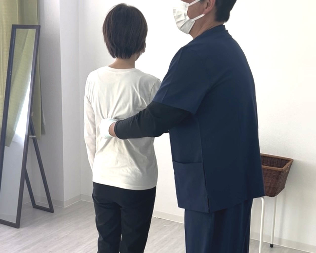 ①背骨が原因ですから背骨の捻じれ取りは大前提です。しっかりと捻じれ返しながら体幹の歪みも取っていきます。肋骨の絞り込まれているところも形良くします。