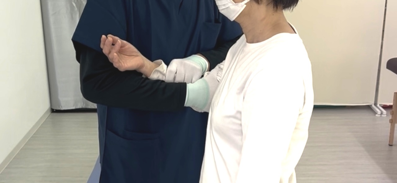 肘や腕も体幹部と繋がっていますので背骨の捻じれをしっかりと取って体幹部の歪みを正していきます。捻じれている上腕と前腕を逆に捻じり返して、指の筋肉も一本ずつ念入り緊張を取ります。肩の筋肉の緊張をとることと肩甲骨の位置を正しく調整しながら緩めていきます。肘だけの施術ではよくなりません。